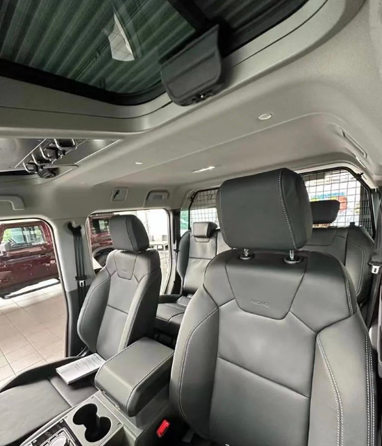 内饰布局:总体延续老款卫士布局,借鉴两幅式方向盘、中控区域长方形出风口(中间嵌入指南针液晶表盘)、机械按键、副驾抓手设计等元素,此外车辆还新增部分越野配置,如副驾A柱抓手等。掷弹兵采用复古机械设计,更多咨询请致电刘经理15222407919《同微信》仪表板两侧设圆形出风口,配备宝马鸡腿电子档杆,其左侧为传统手刹,右侧为分动箱挡杆,手刹旁多功能旋钮则控制不同功能选择(包括选择键、菜单键、返回键、音响键、音频键、越野键,类似宝马多功能旋钮)。