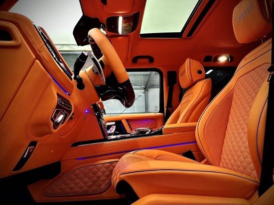 巴博斯G8004*4。 哑光黑。耀岩黑。 爱马仕橙内饰。 星光车顶。 800匹马力双涡轮增压发动机。