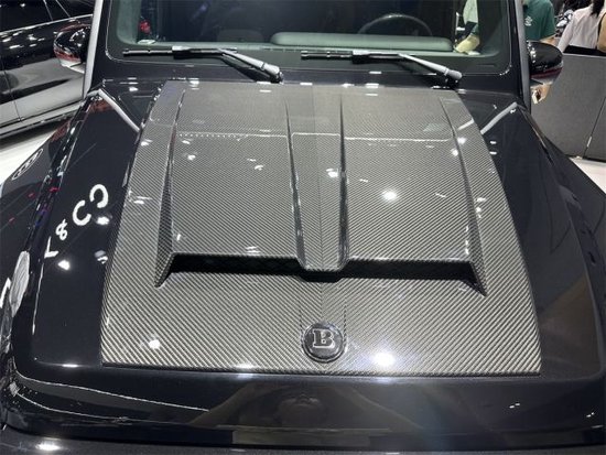 首先我们来看外观,经典的BRABUS黑红主色调,黑色光亮面质感的碳纤维引擎盖罩,碳纤维车顶灯,碳纤维飞翼式扰流尾翼。