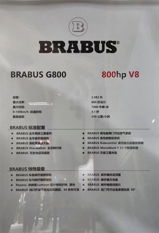 巴博斯G800 (配置|询价)凭借着顶级专业的引擎改装技术,和独一无二的动力性能及崇高质量优势而享誉全球。其产品倍受各界成功人士所推崇。凭借非凡的改装技术目前巴博斯拥有世界上最快的轿、最快的四门轿跑、最快的旅行车和最快的SUV。