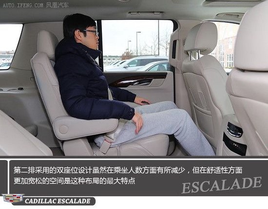在身高180厘米的模特调整好前排座椅后,转身来到凯雷德的第二排,虽然这里采用的是双座位设计,但是其头部和腿部空间还是得到了充分的满足。由于内部布局的缘故,其第二排采用的双座位设计虽然在乘坐人数方面有所减少,但在舒适性方面,更加宽松的空间是这种布局的最大特点。