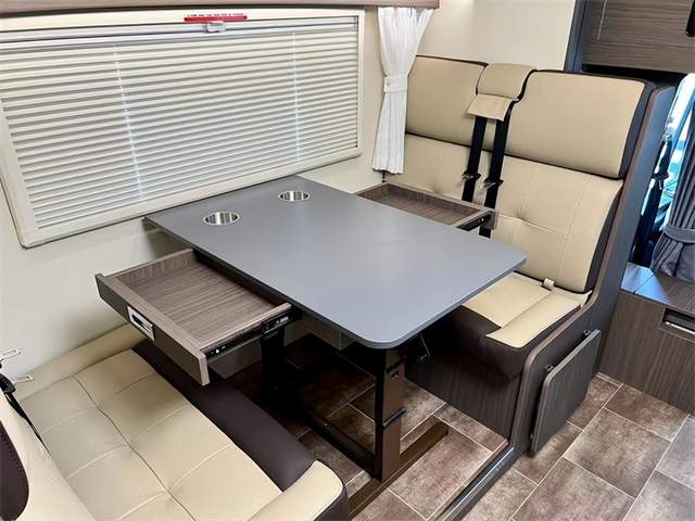 卡座区域采用四人对坐设计,舒适的皮质座椅为您的脊椎健康保驾护航,长途旅行也不会感到疲劳。内饰整体采用深色木纹材料,更显沉稳大气。随车的赛特福德150升房车专用冰箱也安装在卡座区域后方,便于拿取物品。