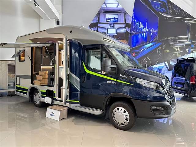车身外观配色方面采用荧光绿和墨蓝配色组合,搭配车侧的拉花,带来十分酷炫的视觉感受。外观选用玻璃钢材质(超轻纤维板三明治复合墙板)打造,看上去具有光泽感。整车尺寸为5995×2255×2910mm,轴距为3450mm,拥有蓝牌C照即可驾驶,最大允许总质量4498kg。