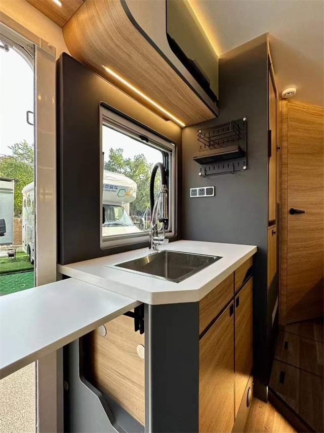 厨房料理台面配有不锈钢水槽+软管水龙头。厨房台侧边,还带有可翻折拓展式桌板,以此来延伸料理空间,不用时可以收起还不占用内部空间。