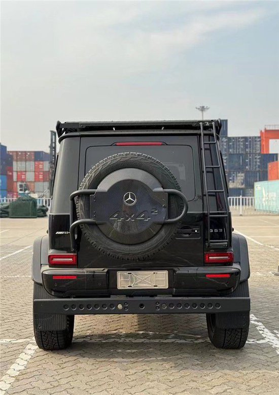 23款奔驰G63 4X4车顶的辅助灯光,越野的味道很浓厚。奔驰AMG G 63 4X4加宽了轮眉,新增加了车顶行李架,并还设置了专门的梯子可以方便拿取行李,尾部备胎也看上去更大,整个新车离地间隙变得更高,尾部还新增了一个辅助保险杠。肉眼可见的越野性能全面提升。作为全新一代的升级,新车拥有G 63车型的包围和AMG专属的Green Hell Magno车漆,展现出强大的性能。