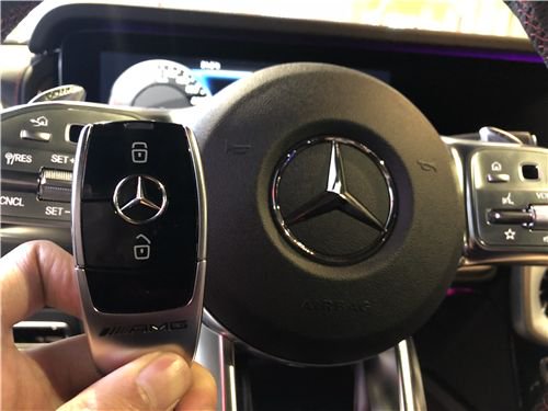 车钥匙造型与普通版无异,正面有AMG字母,背面是阿法德巴赫苹果树、气门、凸轮轴、月桂枝构成的家族徽章。