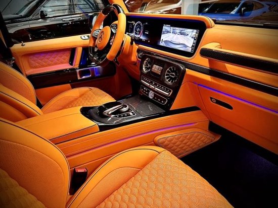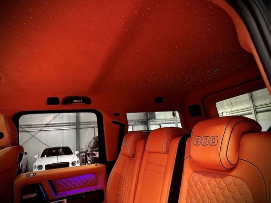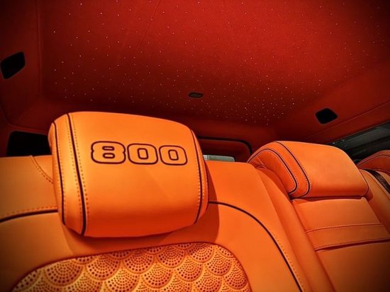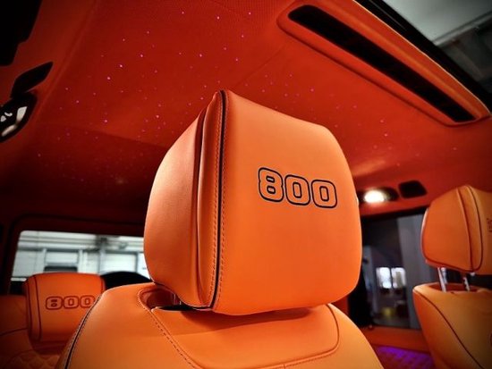 巴博斯G8004*4。 哑光黑。耀岩黑。 爱马仕橙内饰。 星光车顶。 800匹马力双涡轮增压发动机。