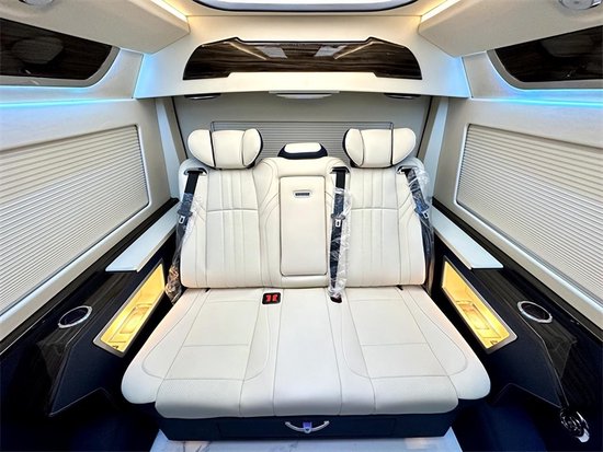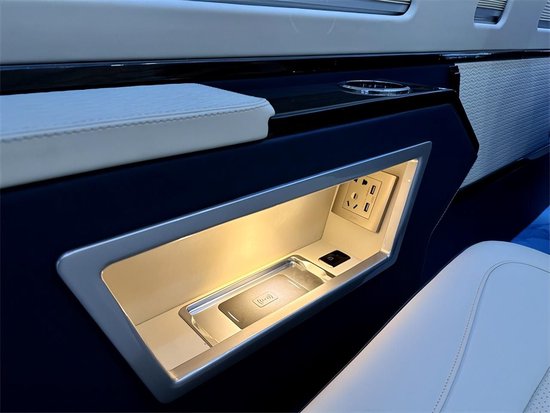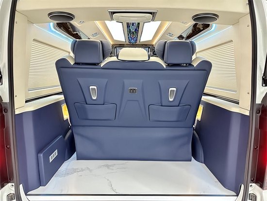 商务车里边除了舒适度,颜值也很重要的,这款车子就是,米色和蓝色的搭配,大气的同时有比较清爽,看着也不单调,商务用车,这个款式还是很多的。周边的四节做的也很好,侧墙的整体独立包覆,还有独立的造型,储物格里边充电,无线充都有。侧墙的壁灯也有安排上,百褶的窗帘看着也很高级,这样子的车里边的乘坐感很好的。顶部的独特的造型顶灯也是很独特的,主灯光和氛围灯光相交错,也能体现出不同的感觉。