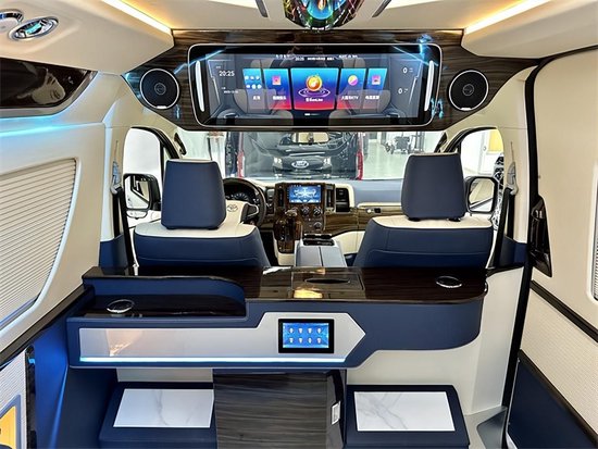 作为一款改装商务车,车里边的内饰都是做的非常精致的,中控驾驶室整体都是真皮包覆搭配着桃木装饰件的设计,还额外配了一个舒适的冰箱,具有冷冻和保温的双重效果。现在的商务车也是更多的注重车内的舒适性豪华型,毕竟商务的用途更趋向于内部,乘坐的满意度是非常重要的。