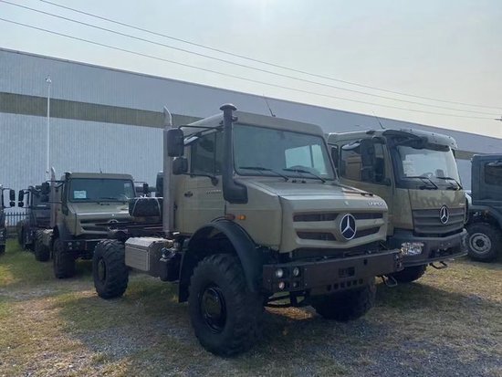 新款四驱进口奔驰乌尼莫克U4023 (配置|询价)拥有强劲的越野性能,很大程度上得益于其“鹅颈式”纵梁的布置。梯形车架与两个相对的纵梁构成一个U字型,并焊接在管状纵梁上,可允许横纵梁产生较大的扭转度,通过横向推杆与螺旋弹簧间的联动,能实现高达30度的车桥对角扭。