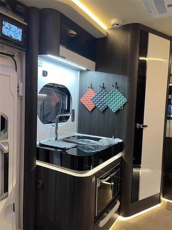 同时,在庞大的车身和吸睛的颜值之内,S820 Plus房车还配备有丰富的生活功能,让用户可以更为轻松惬意的生活在魅力四射的景色中。车身四周配备有风感自动收回电动遮阳棚、电动二级上车踏步、定制版额头呼吸灯+外置照明灯、清水箱注水口、取水口、新能源快充电源口、220V用电插座、外抽拉柴油灶、折叠置物板、贯通式储物舱、2点式电动驻车平衡器、6路监控涉嫌头等设备。