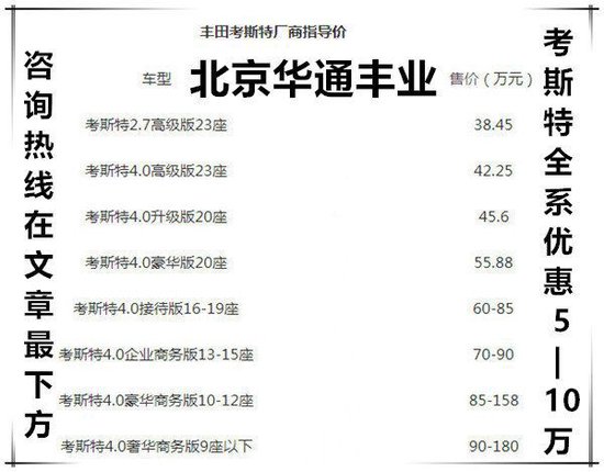 丰田考斯特7座8座9座10座11座12座13座14座15座16座17座18座19座20座21座22座23座。全系现车,改装版本通勤版、汇报版、接待版、豪华版、旗舰版、至尊版、至尊VIP版丰田考斯特设有多个版本,有高级车(20、23座位)、豪华车(10-20座位)以及20座特别行政版(10-20座)。该车的长宽高尺寸是一致的,长7.005米,宽2.04米,高2.774米,高大端庄的外形设计在给您带来舒适的坐乘空间的同时也在显示了高大上的设计并且合理的曲线设计。