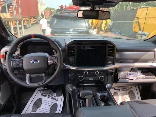 新款福特猛禽内饰采用独特的中控台和门饰板面漆和真皮包裹的方向盘。中控台部分辅以银色饰板装饰,六指针仪表盘的设计有些后工业时代的复古风格。采用带电冷热功能的可记忆式皮革座椅,头枕四向可调,搭配铝饰条和黑色钢琴烤漆内饰可电动升降的后窗带隔板和电热除霜功能。
