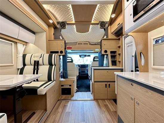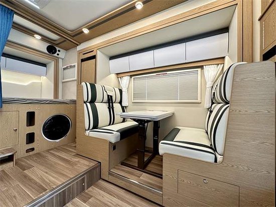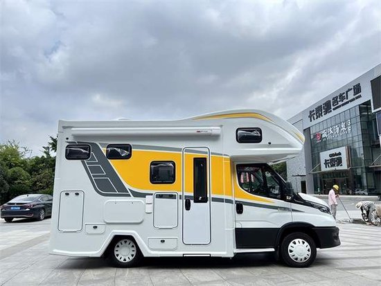 戴德最新推出的E途Pro Max玻璃钢版,相对于E途Max+,这款车的配置更高;同时,也没有碳纤维版那么夸张的售价。这款车的售价是141.8万,更重要的是提升了内部17%使用空间。第二点,车身拉花相比之前进行了优化,这款车以金色和黄色为主色调;第三点就是整车的的细节方面采用开模工艺,相比旧款,模块化的地方增加了。车身技术层面,选用的是5公分热断桥PVC墙体,额头区域为双层PVC包覆,保温性能更好。整个车身外尺寸为5990×2490×3180(mm),内高/宽分别为1940mm和2210mm。