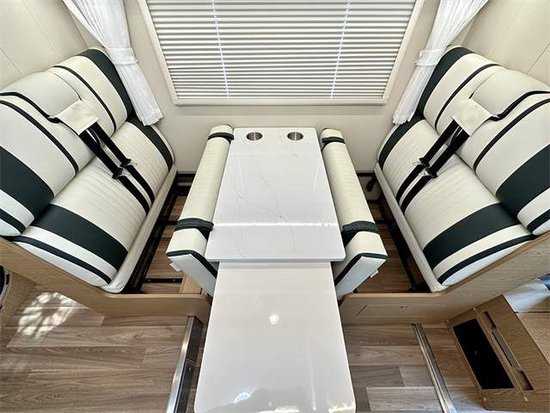 不同是市面上常见的C型房车,底盘部分标配空气悬挂系统,可自动调节水平高度,大大的提高了行车安全和舒适度;此外大力神四方位电动支腿并带有水平调节的功能,驻车后增加稳定的同时也提高了的底盘的观赏性。