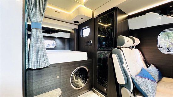 厨房区的配置可真是一点都不马虎,进口顶级汉斯格雅厨卫五金件儿,Thetford 多功能水盆、Panasonic微蒸烤一体、还有已经配置齐全的调料罐、碗筷、炒锅炖锅等。这样高级的厨房,你想先做哪一道菜。睡卧区采用5D保健床垫,共6层工艺,舒适促睡眠,米色真皮包裹,透气性和回弹性非常棒,2公分厚的乳胶层,防螨防菌。睡觉需要的枕头、被子我们都已经给你准备好了,是不是很贴心。隐藏式的收纳空间,不得不说,很实用。