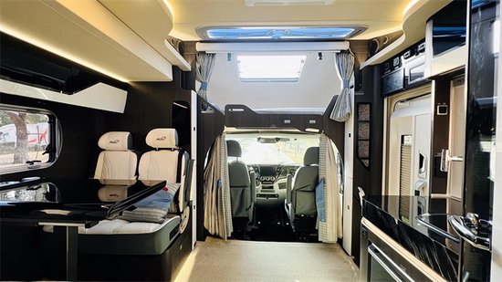 来到生活区,给我的第一感觉:已经有了豪华房车的样子!毕竟这是一款高达158万的房车,放眼望去,能看到的都是品牌配件,这是保证它是一款高档房车的基础。也许是国人对于豪华车的审美习惯而形成的思维定势,只有暗沉色的商务风格才能凸显其高端定位,所以我们从拍摄镜头看到的内饰被大量的暗沉色家具所包围,米白色的和暗色形成了极大的双色反差。新车采用了无主光源的设计思路,加上暗沉色家具饰板本身吸光的特性,车内灯光偏暗。新车内部为常规的额头床双人床+中置4人会客区+厨房区+后置拓展床+卫生间布局,满足4-5人的生活起居。