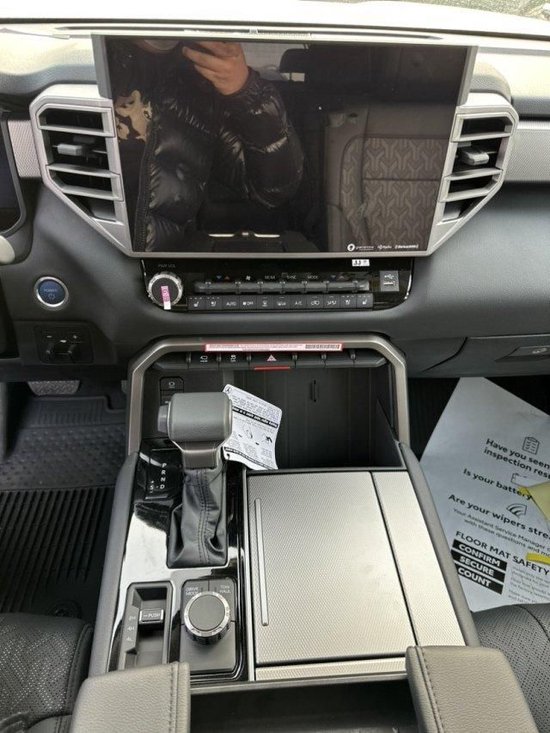 2023款丰田红杉车内采用了大量软质材料包裹,部分区域还加入了缝线处理,显得档次感和质感十足。另外车内采用的是四辐式多功能方向盘,并保留了很多物理按键,足以满足驾驶时想要的操控感,车内的科技氛围是通过12.3英寸的全液晶仪表盘和14英寸的中控屏来实现的,中控屏两侧的空调出风口,虽然没有采用时下流行的贯通式设计,但在中控台上对称排列也别有一番风味。