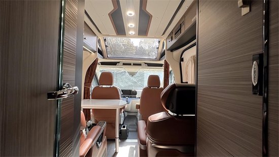 内部生活区布局紧凑,车厢内功能设施丰富。用材方面,整车采用了E0级家具板材(进口芯材)、乘用车级环保软质ABS模具内饰以及进口防水易清洁地板革,整体内饰精致优雅,车厢内部的储物柜均采用了高档轻奢定制柜体锁具,进一步提升了内饰质感。生活区灯光系统丰富,配备了全车氛围灯,二阶迎宾踏步处也做了氛围灯带,满足乘客夜晚的光亮需求。生活区布局还是比较保守,也较为经典,更加贴合车友的旅居用途,整车水电控制系统依旧放在中门上方,7寸的液晶屏集成灯光、电池、设备、水路的控制以及观察,方便操作,
