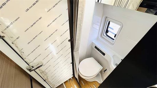内部生活区布局紧凑,车厢内功能设施丰富。用材方面,整车采用了E0级家具板材(进口芯材)、乘用车级环保软质ABS模具内饰以及进口防水易清洁地板革,整体内饰精致优雅,车厢内部的储物柜均采用了高档轻奢定制柜体锁具,进一步提升了内饰质感。生活区灯光系统丰富,配备了全车氛围灯,二阶迎宾踏步处也做了氛围灯带,满足乘客夜晚的光亮需求。生活区布局还是比较保守,也较为经典,更加贴合车友的旅居用途,整车水电控制系统依旧放在中门上方,7寸的液晶屏集成灯光、电池、设备、水路的控制以及观察,方便操作,