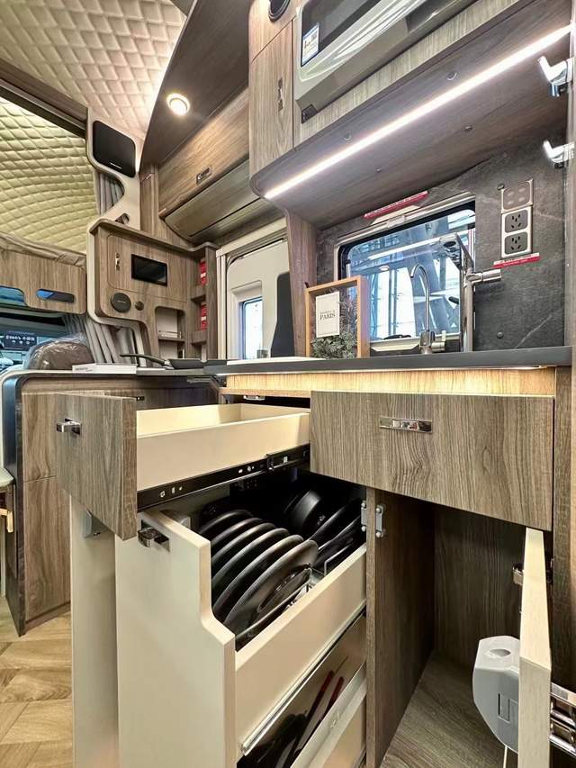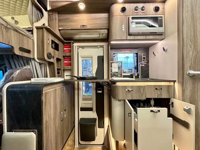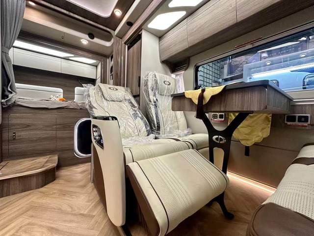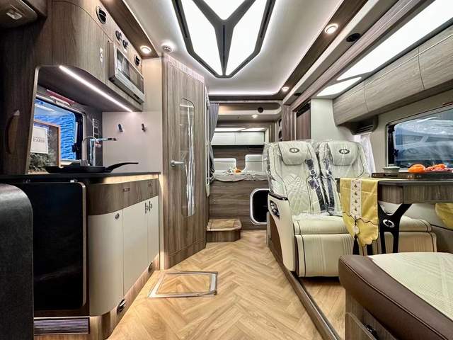 很多人都说房车生活以简洁为主,但是这款进口的房车主打的就是高奢品质,虽说是个双拓展车型,但他实际是为了2-3人安排的高品质房车。