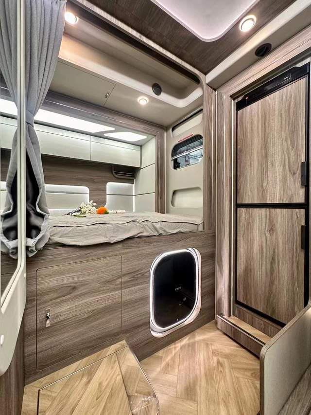 整车在后部分也做了严格的造型装饰,后横床不再简单单挑,代替的是氛围感觉。包括生活设施上的梳妆镜,和双门冰箱,都安排上,洗衣机更不用多说,肯定也要配上。