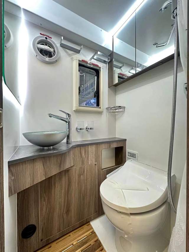 卫生间功能齐全的很,淋浴花洒,洗漱池,梳妆镜都有安排上,主打的就是让出行如在家的感觉。