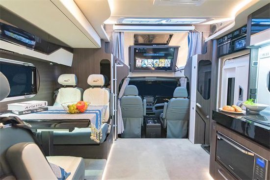 瑞弗房车启界S820外观以银色为主色调,两侧搭配深蓝色和白色的拉花装饰,像美丽神秘的浪花,展现纯粹之美,高级之美!额头处的线条流畅圆润,为低风阻设计,有效地降低了风阻,规避风噪,增强了行车效率。车身的外形尺寸为5995*2495*3280mm,内部空间十分宽敞,减轻了车内活动的压抑感,上蓝牌C照即可驾驶!