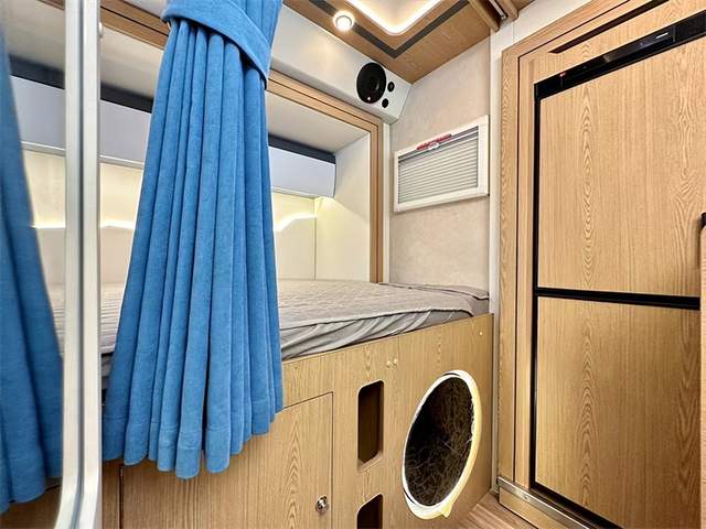 额头床尺寸为2180×1500 mm,整个区域做了软包的处理,细节方面配置了床帘、阅读灯等,床板的下方内嵌了一台32英寸的智能电视。顶部则是做了7厘米厚的保温层,保证了车辆在零下15度到零上45度的保温隔热性能。