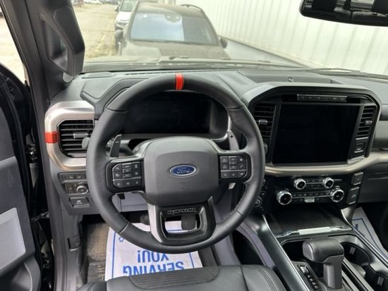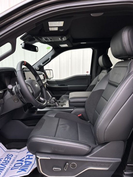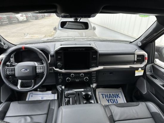 新款福特猛禽内饰采用独特的中控台和门饰板面漆和真皮包裹的方向盘。中控台部分辅以银色饰板装饰,六指针仪表盘的设计有些后工业时代的复古风格。采用带电冷热功能的可记忆式皮革座椅,头枕四向可调,搭配铝饰条和黑色钢琴烤漆内饰。可电动升降的后窗带隔板和电热除霜功能。