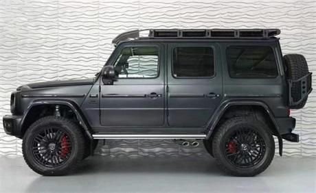 23款奔驰G634×4²车身一侧窗线的位置靠后,车窗玻璃方,巨大的轮眉向外凸出,还有银色的脚踏板。前翼子板上有一个V8的标志,轮毂的大小为22寸。新车接角达45°,离地间隙为351mm,涉水最大深度为910mm。