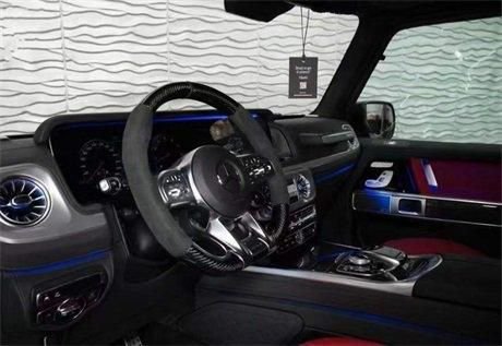 23款奔驰G634×4²在内饰上,该车配备了与车身颜色相同的氛围灯、内饰采用双联屏外观设计、全液晶仪表、中控屏规格均为12.3寸。车内有很多碳纤维点缀,副驾驶大扶手还在,方向盘是平底式。