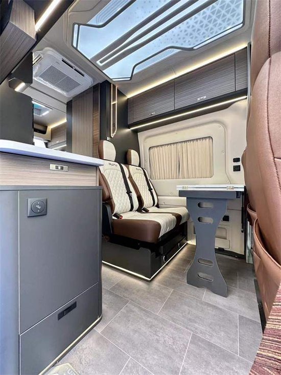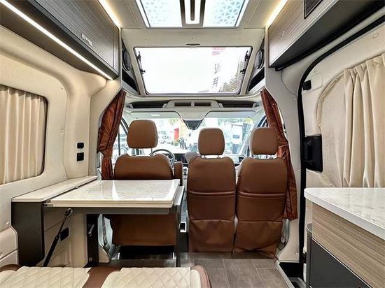 驾驶室座椅采用了皮革座椅包覆,为车内营造出商务精致的氛围。车辆后方配备了高档轻奢丝纺拉帘,与整车同色系,彰显出豪华与品味。驾驶室配备定速巡航系统、ESP车身稳定系统、无钥匙进入/启动系统以及12.3寸中控屏/仪表盘等设备,提供了便利和智能的驾驶功能。顶部配备进口定制的可开启全景天窗,为车厢内部带来更好的采光效果。