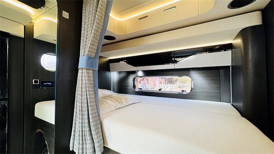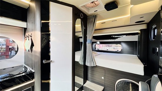 厨房区的配置可真是一点都不马虎,进口顶级汉斯格雅厨卫五金件儿,Thetford 多功能水盆、Panasonic微蒸烤一体、还有已经配置齐全的调料罐、碗筷、炒锅炖锅等。这样高级的厨房,你想先做哪一道菜。睡卧区采用5D保健床垫,共6层工艺,舒适促睡眠,米色真皮包裹,透气性和回弹性非常棒,2公分厚的乳胶层,防螨防菌。睡觉需要的枕头、被子我们都已经给你准备好了,是不是很贴心。隐藏式的收纳空间,不得不说,很实用。
