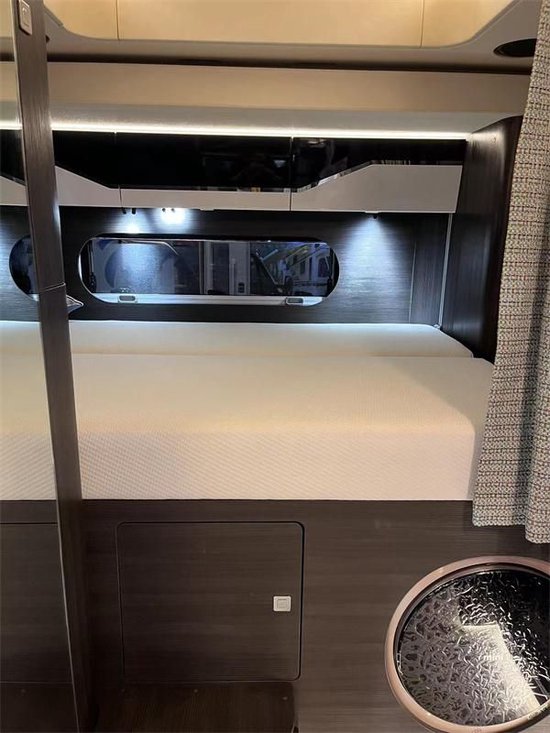 休息区位于车厢的尾部,床位非常宽敞,可以轻松地容纳两个成年人睡卧。床位的后侧和旁侧配有外推窗,保证了床位处的空气的流通,以及良好的采光性。上方则是储物吊柜,方便日常衣物的存放。顶部配有照明灯,灯光柔软明亮,满足夜间照明的需要。