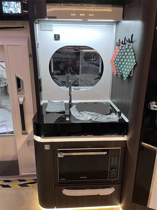 车身结构采用的是高强铝结构、电泳防腐车架,质量轻耐腐蚀。左侧配置三个不同规格的房车侧推窗、外推窗,给额头床、会客区、尾床提供采光通风。下方设有两个长条储物舱,尾部设有左右贯通式的储物舱,储物功能强大。
