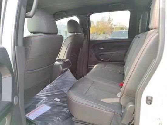 23款尼桑泰坦,配置:PRO4X,白黑、黑黑、灰黑、深蓝/黑、沙漠风暴/黑5.6LV8发动机,4*4,9速自动变速箱65W四轮盘式,坡起辅助,陡坡缓降,后差速锁,18轮275/70全地形轮胎,全尺寸备胎,紧急制动,行人监测,车道保持,盲区监测,路标识别,倒车预警,预碰撞预警,前排/膝部/侧气囊,气帘,儿童座椅接口,防抱死,车身稳定控制,7英寸仪表盘,NISSANconnect连接,支持appleplay;AndroidAuto,USB接口,蓝牙连接,购车热线:18812637416刘经理 (同号微信)声控系统,织物座椅,前排8向电动腰部调节座椅,后排座椅60/40折叠,皮质多功能方向盘,座椅储存空间,可折叠脚垫,110V电源输出,双区空调,自动调光多功能后视镜,巡航系统,无钥匙进入,一键启动,6喇叭,AM/FM,脚垫,外部:LED大灯/远光灯/雾灯/后车斗灯,大灯手动调节,黑色轮眉,黑色智能门把手,电动/可加热外部后视镜,拖钩(4针/7针连接),喷涂后车斗,红色前拖钩,黑色尾门带PRO-4*标志,感应雨刷