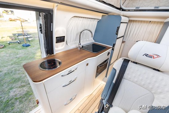 右侧厨房区,直通车尾,面积宽大,配备有电磁炉、高脚水龙头、带盖式洗菜池、翻折式扩展菜板、平板式光波烤箱一体微波炉、组合式餐具储物柜等设备。