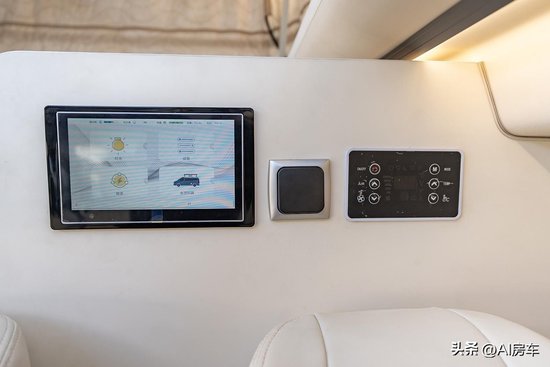 后方商务座椅头部位置配备水电与灯孔面板。在水电方面,整车标配有460AH锂电池组、3000W充逆变一体机、75L食品级易清洁净水箱、40L易清洁灰水箱。