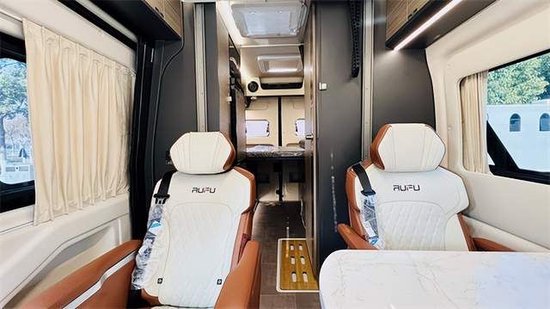 驾驶室为三座布局,采用了防滑潜功能座椅,车辆提供了ECO节能模式/SPORT运动模式,智能驾驶双模式让用户旅居更加轻松自在。安全辅助驾驶方面,车辆配备了12.3寸双联屏、电动调节加热后视镜、EPB电子驻车系统、PATS电子防盗系统、PEPS无钥匙进入/一键启动、Telematics Pack (远程启动发动机、车队管理、远程诊断等)、EPAS电子助力转向系统、多功能方向盘、主/副驾驶安全带未系提醒、倒车影像+倒车雷达、ESP车身电子稳定系统、胎压监测系统、定速巡航、自动LED大灯、自动雨刮、GPSFM倒车监视一体机等系统及设施。