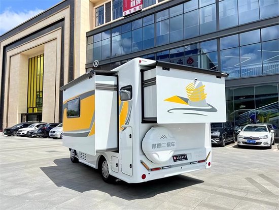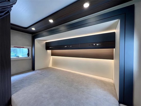 车内部分采用中式的家居风格,更符合中国人的审美,会客厅部分采用的是对座式沙发卡座的设计,直径达到了1.95m做到了行业内最宽,两个成年人面对面坐不会碰到腿。车内储物空间同样十分出色,会客厅上方拥有4组吊柜,后尾部3组,沙发卡座下方同样是储物空间,加上超大的储物仓大概拥有2500L的储物空间可供使用。
