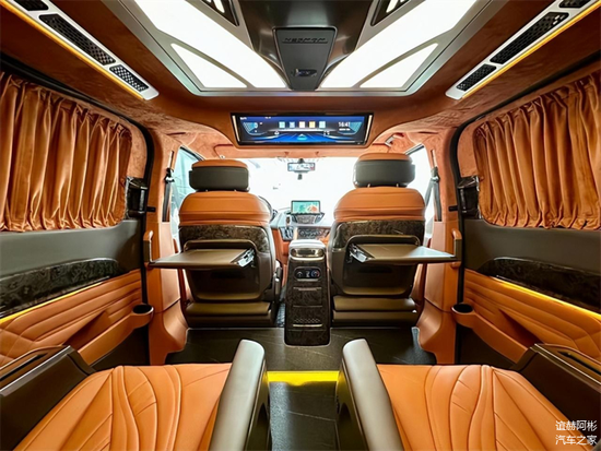 二排航空座椅具备通风,按摩,加热,旋转,腿托等功能,其中人体工程学6点位智能气动按摩,旅途的生活也能多一些享受与自在。三排电动调节,配有无线充电,它既可以是一个沙发床,也可以由两个独立的座椅所组成,可满足不同用车的需求。定制高达顶灯,有多种颜色可以调节,适应车内不同的用车氛围。
