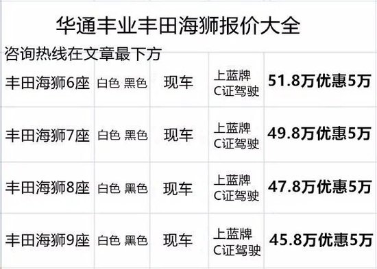 丰田海狮4s店华通丰业出售2024新款改装6座、7座、8座、9座、13座(奢华版、旗舰版、VIP版 超VIP尊贵版、至尊旗舰版) 华通丰业合格证与座位相符全国上牌! 丰田海狮(6座/7座/8座/9座10座/11座/12座/13座),9座以下丰田海狮可上蓝牌! 实力大厂,值得信任,欢迎来电详询!专业改装参谋为您服务!质量担保,价格优惠。提供板车运输服务本公司现场改装,主要运营丰田考斯特 (配置|询价)商务车型。24款丰田海狮新款内饰风格实车到店,华通丰业进口丰田海狮九座现车发售。2024款丰田海狮属中型汽油机,全国可上牌。24款丰田海狮经过内饰升级,华丽变身奢华商务车,5米9的车身,它的内部空间在商务车市场如今是傲视群雄。作为唯一一台进口蓝牌商务车,海狮目前还没有竞争对手。