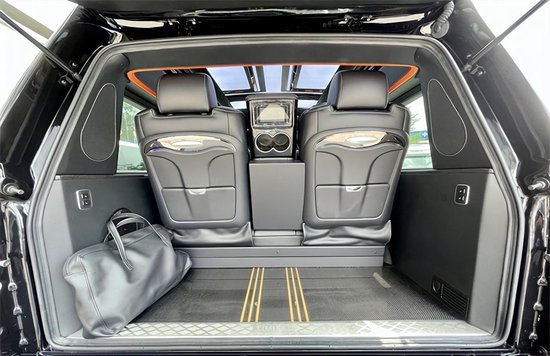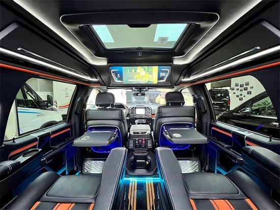 三排沙发床采用分段式设计,两侧巧妙地满足了不同乘客的需求,无论是想睡的人还是想坐的人,都能享受到互不干扰的舒适体验!整个车的外观造型和内饰材料也非常有特点。整辆车均采用真皮材料进行包覆,门板、座椅、顶部以及可触及的区域均经过精细的加工处理。