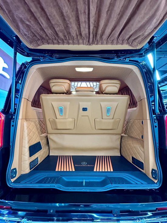 整车的座椅,最后一排的沙发床,能够180度的放平,还能和中间两个座椅组成会客厅魔术,还能当成床模式,不管是休息还是开会,一款商务车内都能满足。此外,这款车型的后备箱空间也是很大的,放高尔夫 (配置|询价)包,钓鱼包,出去游玩,不用担心空间性,奔驰威霆能够给到最舒适的状态。