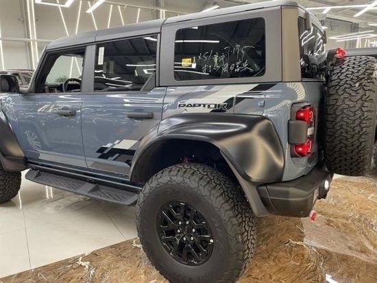2023款福特烈马猛禽版部车的身材显然比原来普通版福特烈马bronco看起来更壮实了,因为猛禽版尺寸略有变化,更关键的是轮距扩大,宽大的感觉甚至超越牧马人 (配置|询价)。车辆底盘悬架离地间隙也抬升了,目测最小离地间隙已经可以达到350毫米以上,这就相当于原厂升高效果。