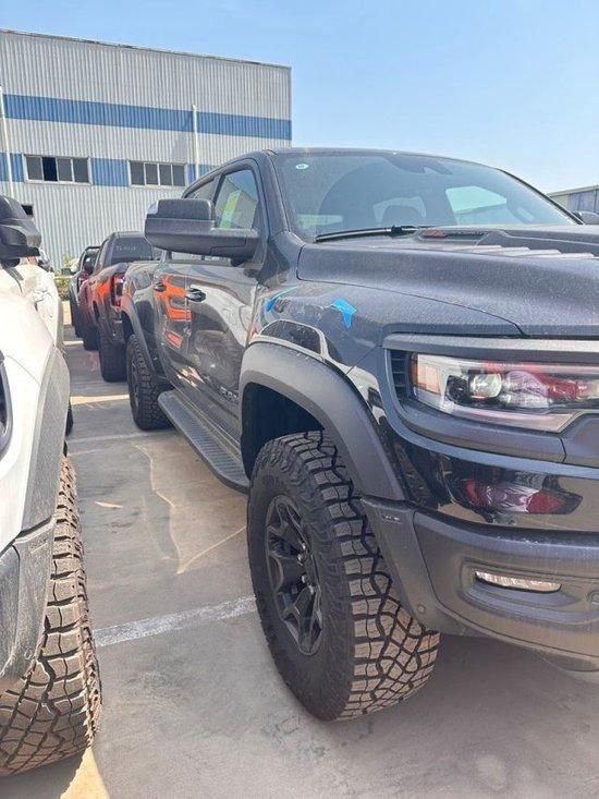 全新2023款道奇霸王龙传承了道奇Ram家族高大威猛的造型设计,同时细节部分融入了更多高性能元素,包括经过黑化处理的前格栅,引擎盖两侧的黑色进气口,以及为了容纳巨大的机械增压器而设计的通风口,前倾式车头,相较中规中矩的家族设计无疑多了几分对路面的侵袭感。购车电话:13116175210 张女士 同微信