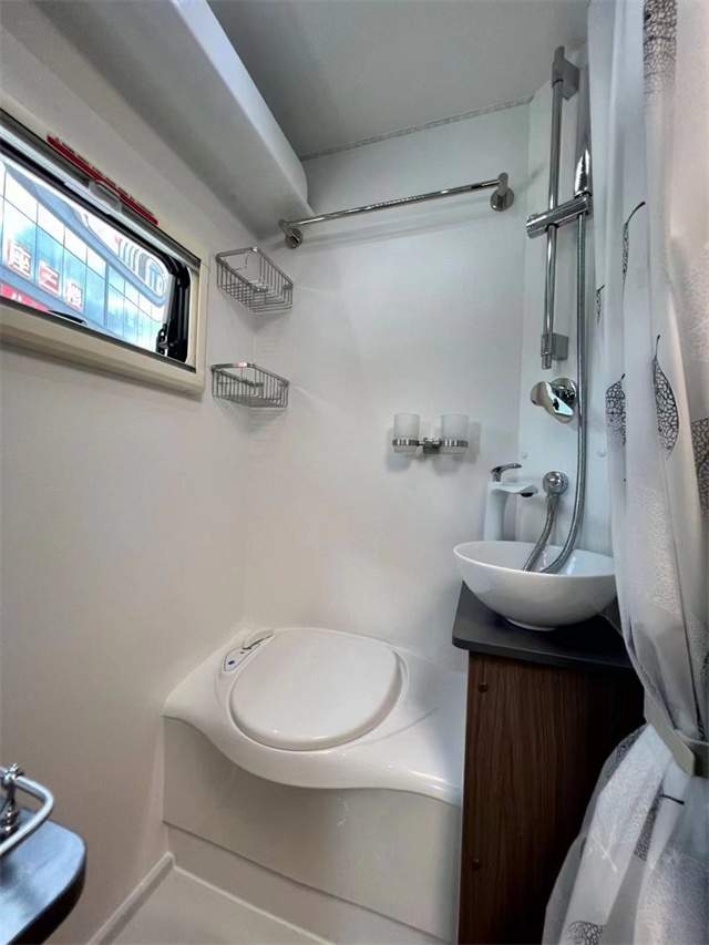 一体式洗手间空间非常充裕。集多种功能一体,拥有马桶,水龙头,洗脸盆,淋浴,浴镜,烘干机,晾衣绳,浴灯,换气扇。配置齐全,而洗衣机设计在卫生间确实更加合理,不会把水弄的哪都是,烘干机也是很实用的设计,在野外的时候把衣服挂在外面容易弄脏,挂在卫生间更加干净,烘干机一开,干的也快。