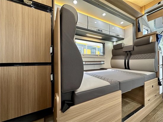 会客区采用沙发卡座加升降桌板的组合设计,日常用餐、小型聚会都很合适。座椅顶部安装有一排吊柜,车内储物空间更加充足。日常打开外推窗,拉下防蚊纱窗,保证通风透气的同时也避免蚊虫进入,大视野的尺寸也能够更好地观赏窗外美景,与自然近距离接触。夜晚睡眠时降下桌板,与会客区可以形成一张临时休息的床铺。