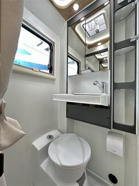 厨房区配备了一块延伸桌板,得到了一些额外的空间。橱柜内提供的储物空间主要是这两个抽屉,下方抽屉可双向使用,车内做饭车外做饭都能派上用场。橱柜内配备一款小天鹅3kg洗衣机,内置多种洗涤模式,定时使用45分钟,耗水量基本保持在26-28升之间。用电方面,除刚启动的时候功率较大外,工作正常之后相对是比较省电的。这款车提供的是一款210升的净水箱+50升电热水器,60升灰水箱,完全能够支撑洗几次衣服的续航。